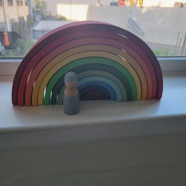 12-piece handmade solid wood Montessori rainbow. The pieces can be stacked on top of each other. Toy is very sturdy and of high quality. Used but in excellent condition.